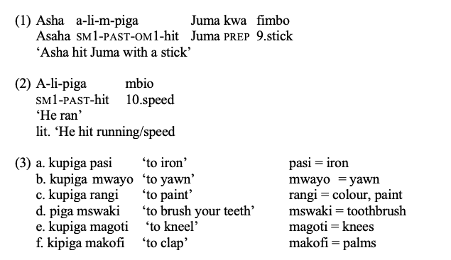 The East African Bantu language Swahili employs a light verb construction based on the verb piga. In its transitive usage, piga means ‘hit’, as can be seen in example (1) below. However, –piga also frequently combines with nominal forms to render meanings which are non-compositional. An example of this usage is shown in (2), while further Verb +Noun combinations involving piga are shown in (3).